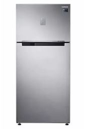 un réfrigérateur à deux portes avec le congélateur en haut, équipé de la technologie Twin Cooling Plus et d'un distributeur d'eau intégré. Il est en inox avec un affichage n
