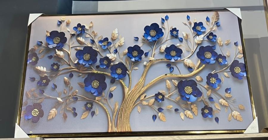Ce tableau moderne présente un arbre artistique orné de fleurs bleues en relief, offrant une combinaison harmonieuse de couleurs froides et de reflets dorés. Une pièce d’art élégante qui ajoute une touche de sophistication et de dynamisme à votre d�