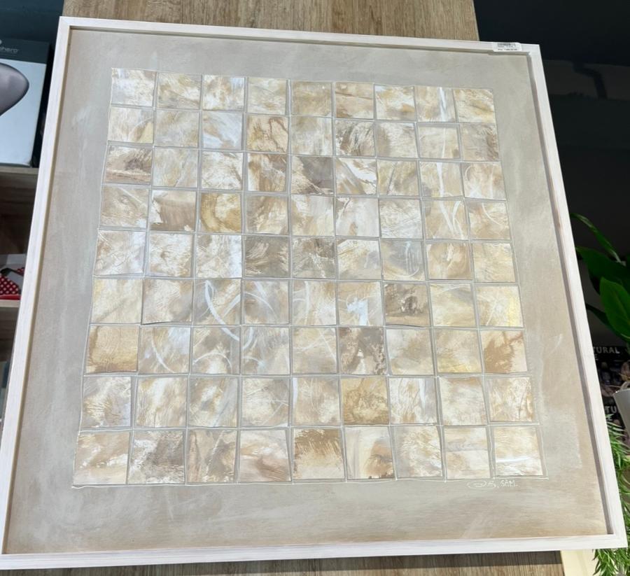 Ce tableau met en valeur deux ustensiles traditionnels en métal doré, présentés sur un fond tissé beige. La finition du cadre apporte une touche d’élégance et un style artisanal parfait pour un intérieur classique ou