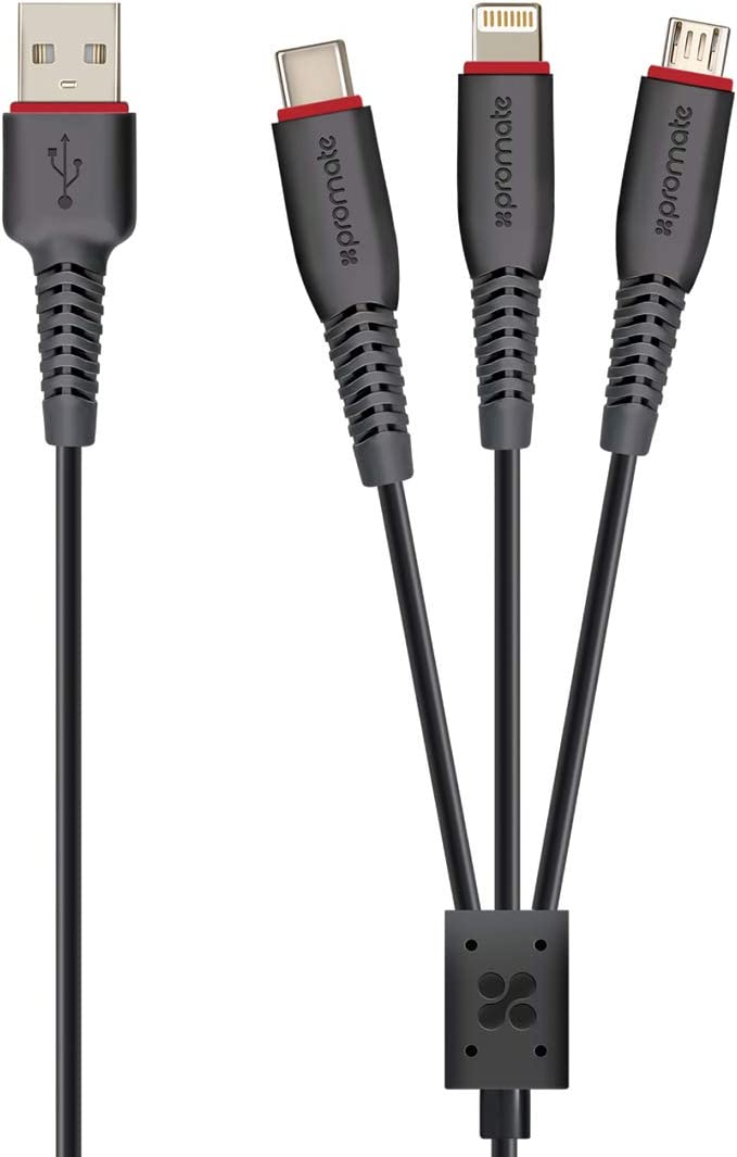 Flexlink-Trio est un kit USB multifonctionnel complet pour bon nombre de vos gadgets de style de vie. Il comprend trois embouts de charge et de synchronisation différents que vous pouvez facilement échanger. Utilisez ce kit pour tous vos besoins quotidiens tels que la connexion à votre smartphone, Lightning Connector ou des appareils compatibles USB Type-C pour une charge, un transfert de données rapide, une synchronisation de fichiers et bien plus encore. Flexlink-Trio est créé de manière unique à partir d'un matériau PVC durable, favorisant un fonctionnement sûr et protégé. Avec Flexlink-Trio, vous pouvez oublier tous les câbles que vous devez transporter pour vos différents appareils. Faites confiance à Flexlink-Trio pour tout. sur le marché. Ne soyez plus jamais sans solution de charge avec ce câble de poche mais formidablement riche en fonctionnalités. Le câble de charge 3 en 1 élimine le besoin de transporter plusieurs câbles pour vos appareils mobiles. Offrant un connecteur Lightning pour votre iPhone ou iPad, un connecteur USB-C pour votre nouveau téléphone ou tablette et un connecteur Micro-USB pour vos anciens appareils mobiles, c'est le câble idéal pour tous vos besoins de charge mobile. Connecteur Micro USB : Bien que de plus en plus d'appareils adoptent la norme USB-C, un grand nombre de téléphones utilisent encore Micro USB comme connecteur - y compris le Samsung Galaxy S7, S7 Edge, J3 et J5 2017, ainsi que la plupart des téléphones de Motorola. Gamme Moto, entre autres. Le connecteur micro USB de haute qualité de ce câble est parfait pour charger ces appareils. Connecteur Lightning : tous les appareils iPhone d'Apple, de l'iPhone 5 au dernier iPhone d'Apple Comme l'iPhone X, 8, 8 Plus, utilisez la norme Lightning - un connecteur réversible avec de grandes vitesses de charge qui se trouve également être inclus avec ce câble. Connecteur USB-C : avec de plus en plus de smartphones, de tablettes et même de consoles de jeux (Nintendo Switch) utilisant la norme USB-C, le connecteur USB-C supérieur de ce câble protège ce câble et garantit que vous pourrez l'utiliser pour de nombreuses personnes, nombreux cycles de vie des appareils à venir. Ce câble est parfait pour une utilisation avec des appareils tels que le Samsung Galaxy Note 8, S8 et S8 Plus, ainsi que le LG G6, Google Pixel, HTC U11, OnePlus 5 et plus. Chargez 3 appareils en même temps : le câble robuste Promate 3 en 1 vous permet de connecter un USB-C, Lightning et un appareil Micro USB en même temps pour les charger tous simultanément - réduisant le nombre de câbles que vous devez emporter avec vous et sans avoir à prioriser un appareil par rapport à un autre. L'USB standard fonctionne avec tous les ports USB alimentés : tout ce que vous avez à faire pour charger avec ce câble est de brancher le connecteur correspondant à votre appareil, puis de connecter l'extrémité USB standard à n'importe quel port USB alimenté, y compris les ordinateurs, les chargeurs muraux USB, les concentrateurs USB. et plus. Permet la charge et la synchronisation simultanées de votre appareil : ce câble de charge 3 en 1 de haute qualité vous permet de connecter votre appareil Lightning, Type-C ou Micro USB à votre ordinateur portable/ordinateur afin de charger votre téléphone et d'échanger/synchroniser des données simultanément. . Design durable : conçu pour résister à l'extérieur, le câble robuste Promate FlexLink-Trio est extrêmement durable et dispose d'un boîtier en polycarbonate. Tandis que la base de décharge de traction flexible garantit qu'elle ne se casse pas lorsqu'elle est utilisée et pliée pendant de longues périodes. Conception de cou flexible "ExoFlex": Conçu de manière créative, le FlexLink-Trio est doté de la technologie ExoFlex. Cette technologie fournit au FlexLink-Trio un col flexible qui assure une durée de vie de plus de 4000 plis, améliorant ainsi considérablement sa durabilité et assurant une sécurité totale. Câble portable robuste sans enchevêtrement : la conception du câble robuste mais mince rend l'utilisation du câble plus facile que jamais et le matériau robuste et résistant signifie qu'il est non seulement beaucoup moins susceptible d'être endommagé, mais il est également plus difficile à emmêler. Avec 1,2 m de long, il fonctionnera admirablement, vous donnera une distance raisonnable entre les appareils et le rendra également très portable. Glissez-le dans votre sac ou votre poche et ayez-le à portée de main lorsque vous en avez le plus besoin. La petite tête fonctionne avec la plupart des coques : le câble Lightning ultra-compact est non seulement assez petit pour s'adapter parfaitement à la plupart des coques d'appareils, mais il est également assez solide pour résister aux débranchements et stockages répétés. Protection complète avec Smart IC : permet à FlexLink-Trio de fournir un environnement de charge intelligent, sûr et efficace. En utilisant des puces intelligentes améliorées, le FlexLink-Trio identifie l'appareil et fournit un courant de charge personnalisé et précis, la vitesse de charge est augmentée de 35 %. Il protège également vos appareils contre les surcharges et les courts-circuits. On n'est jamais trop prudent avec ses précieux gadgets. Longueur de 1,2 m - Idéal pour la plupart des situations : la longueur de 1,2 m de ce câble garantit qu'il n'est pas trop long pour gêner ou faire trébucher, mais pas si court que vous ne pourrez pas utiliser votre appareil pendant le chargement. Le câble USB FlexLink-Trio peut atteindre la distance parfaite tout en étant suffisamment compact pour être jeté dans un sac et partir. Largement compatible avec les appareils : largement applicable dans l'interface IP, la micro-interface et l'interface de type C de la plupart des équipements. Compatibilité avec iPhone X, iPhone 8/8Plus, iPhone 7/7Plus, Samsung Note 8, Samsung Galaxy S8/S8 Plu